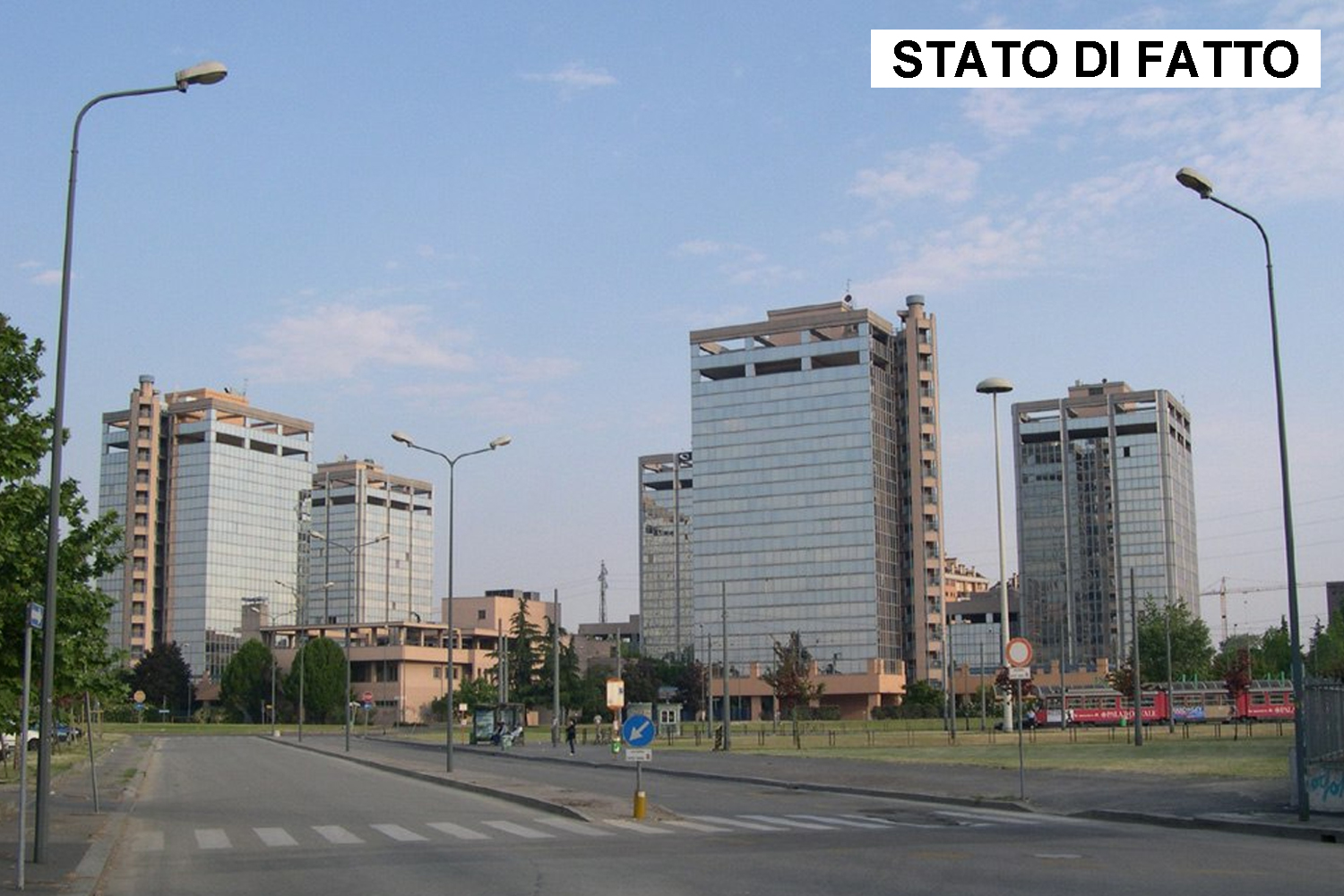 Il tema della proposta progettuale – che si limita a 2 delle 5 torri esistenti, ma vuole immaginare un futuro integrato e complessivo per questo micro-paesaggio del terziario degli anni ’90 – è quello di ricostruire un luogo dell’abitare contemporaneo, con edifici di diversa misura e altezza, un linguaggio aperto e semplice, una sequenza di spazi aperti verdi e pavimentati che abbia un carattere urbano e una viabilità carrabile contenuta e non pervasiva. Il loggiato continuo avvolge l’edificio esistente e lo “addomestica” per una nuova, più vivace, esistenza.