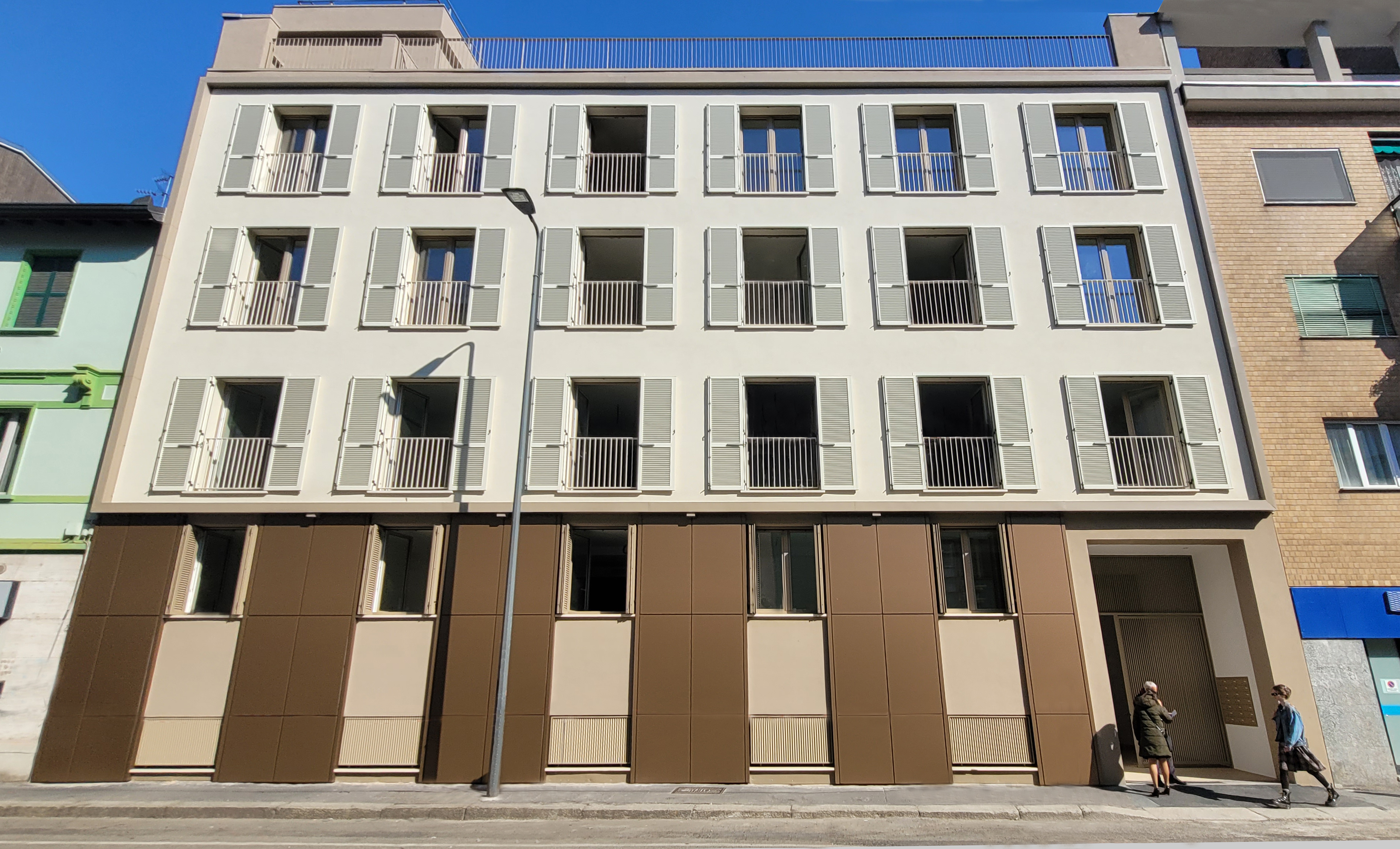 Il progetto ha restituito un edificio completamente rinnovato e sostenibile, grazie alla dotazione di pannelli fotovoltaici e dell’impianto di ventilazione meccanica controllata, e alla sostituzione integrale dei serramenti. Il layout interno è stato totalmente riscritto, ad eccezione della posizione della scala. I 40 appartamenti sono in classe A+, e l’aumento della dimensione delle finestre esistenti li fa godere di maggiore luce naturale.
