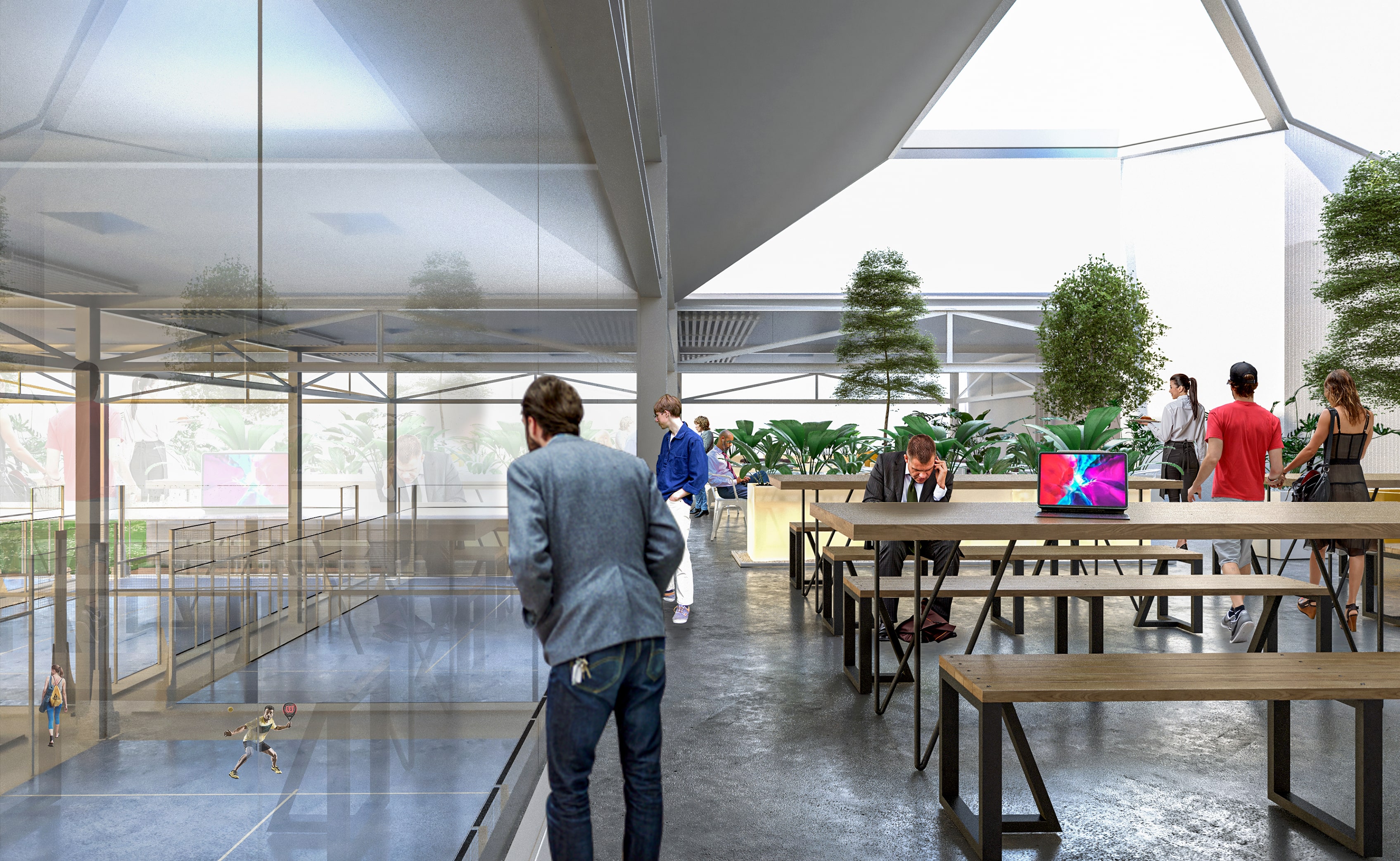 E’ un oggetto plastico, perché visibile soprattutto dagli uffici delle torri, per la moltitudine di addetti e visitatori che si affacciano dalle vetrate ai diversi livelli. E’ del tutto smontabile, ricollocabile e i suoi singoli elementi edilizi (policarbonato, acciaio) sono riciclabili al 100%. L’ambiente interno, oltre alla ripetizione dei campi da gioco, presenta una complessità di carattere “pubblico” con una sequenza di piccoli spazi che, oltre a garantire i servizi minimi (reception, spogliatoi, depositi), garantisce anche uno spazio aggiuntivo, la possibilità di attardarsi nel lounge, al bar o in un piccolo spazio didattico e per riunioni.