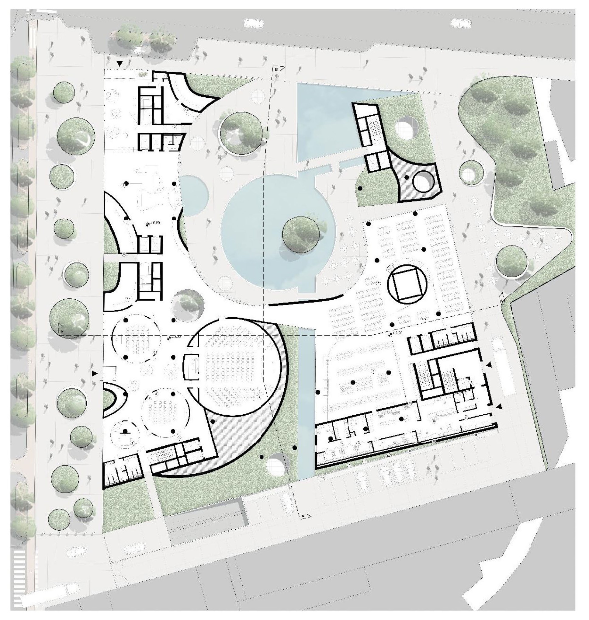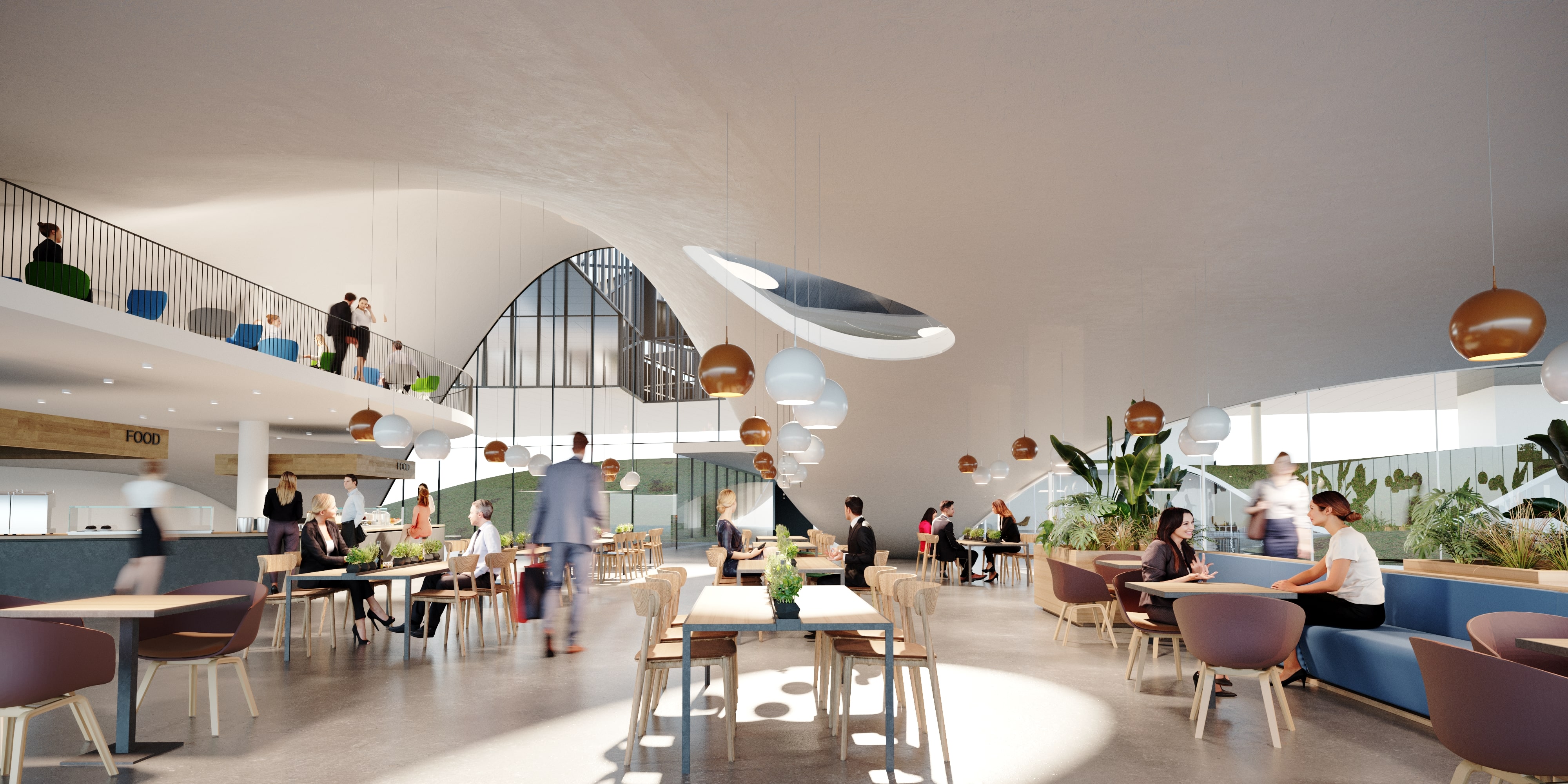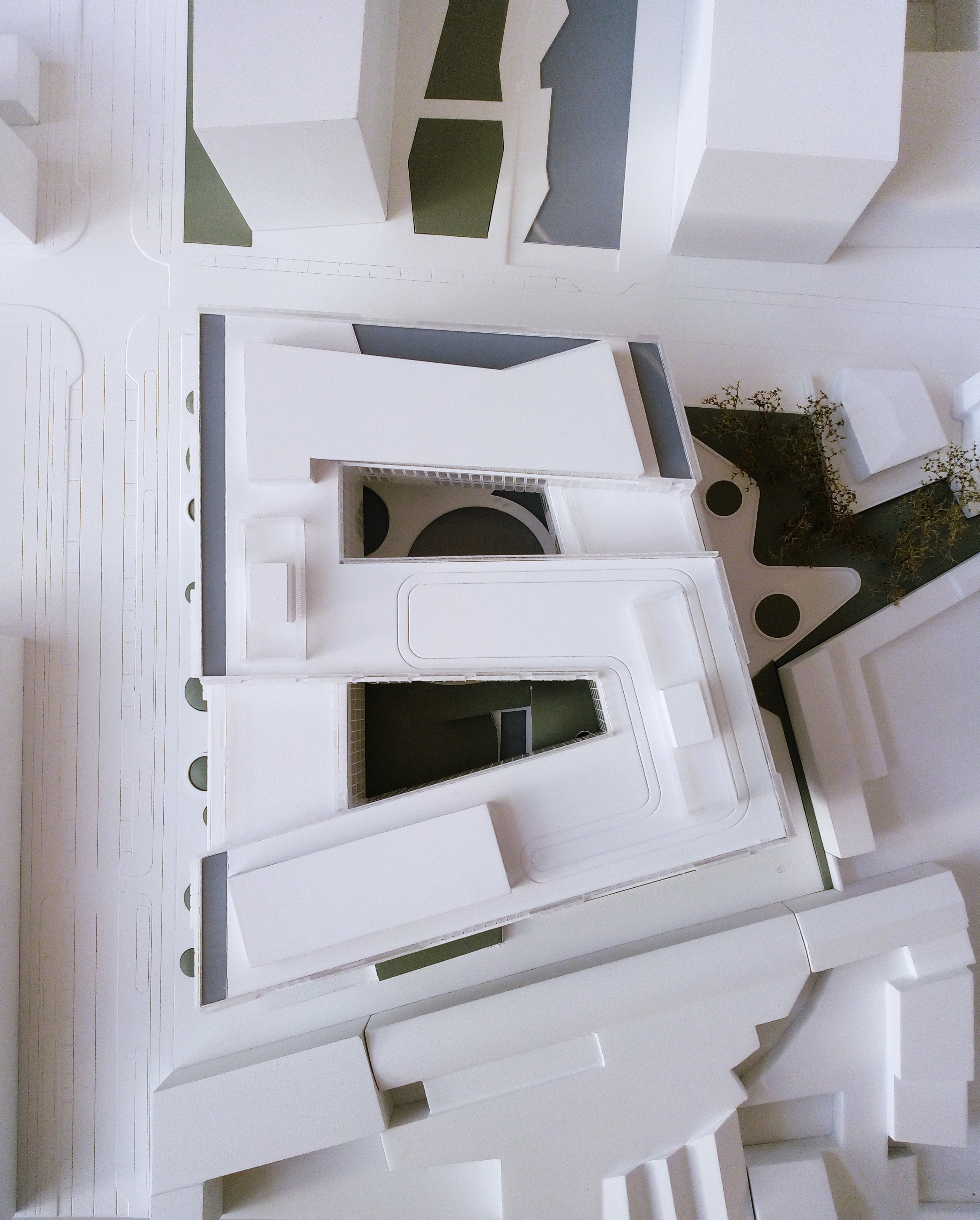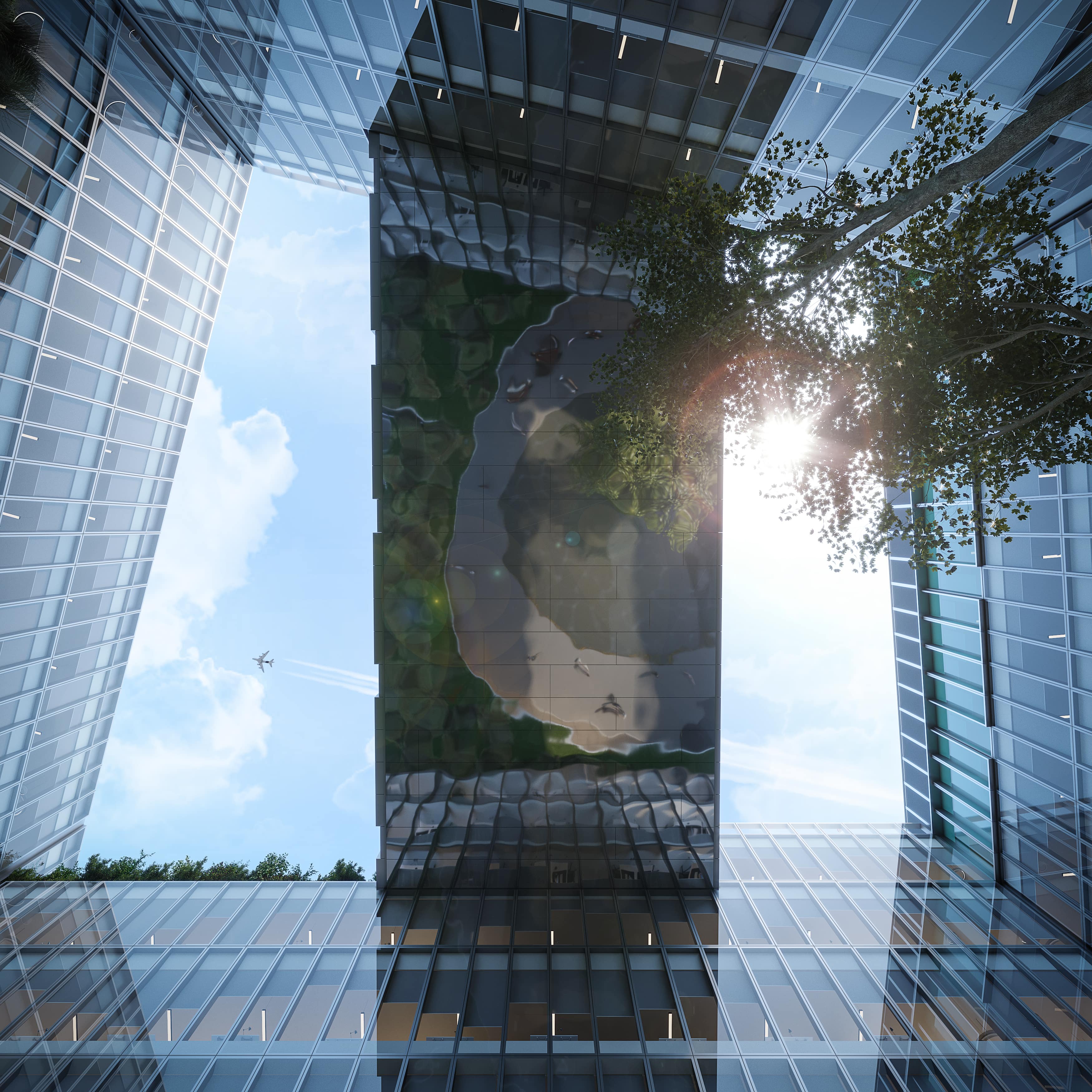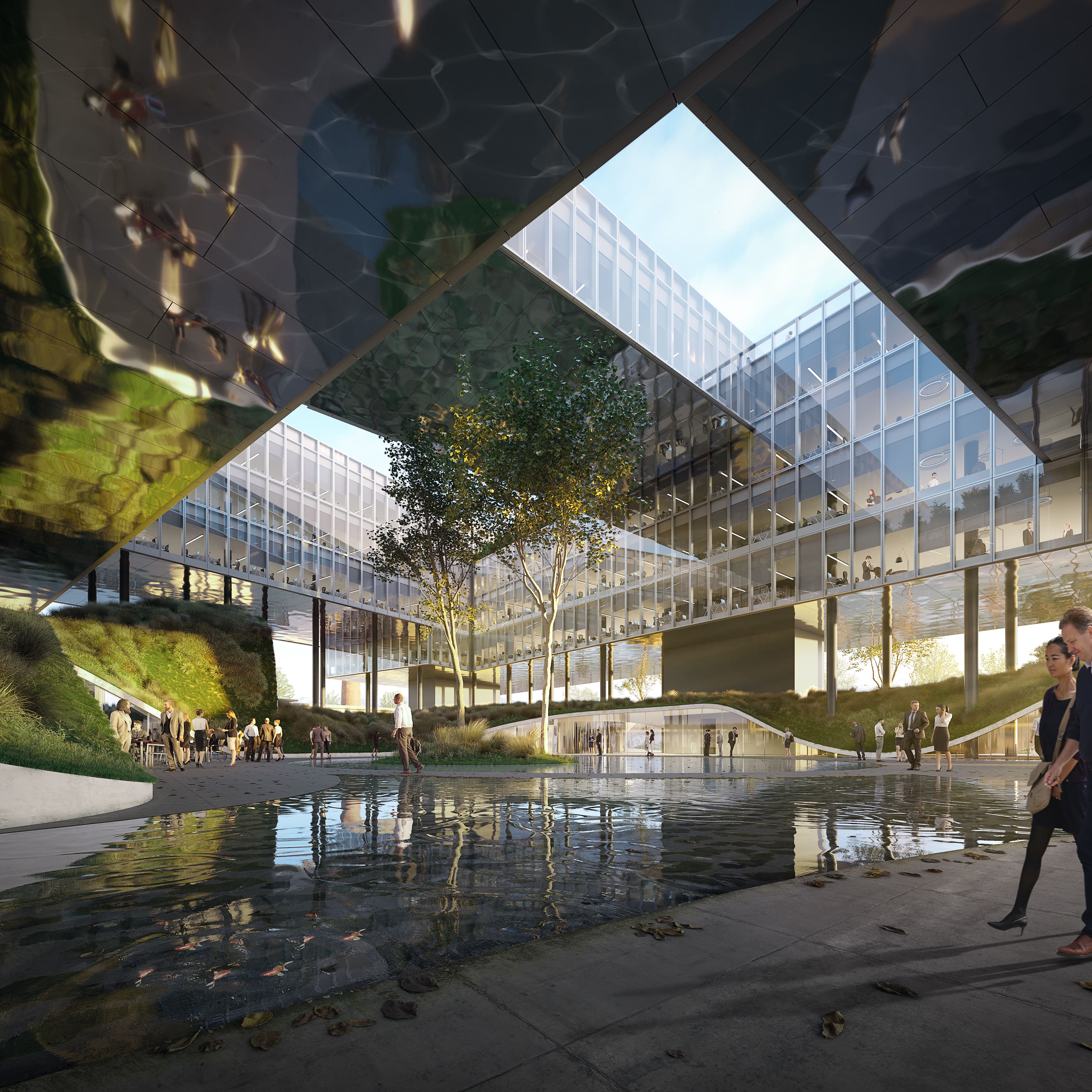 Con una sorta di densità introversa, definisce un paesaggio artificiale al piano terra sul quale si dispiega la trama degli uffici, dei laboratori e degli spazi di riunione. Occupa l’intero lotto disponibile e ricava al suo interno una corte-piazza-giardino capace di mettere in scena il luogo più accessibile, segreto e sorprendente dell’intero complesso. Una interazione tra paesaggi diversi che esplicita la transizione tra idrocarburi ed energie sostenibili del futuro. Negli interni, governano la flessibilità e la semplicità d’uso degli spazi, ambienti dove lavoro, relazioni, scambi incontri devono essere facilitati.
