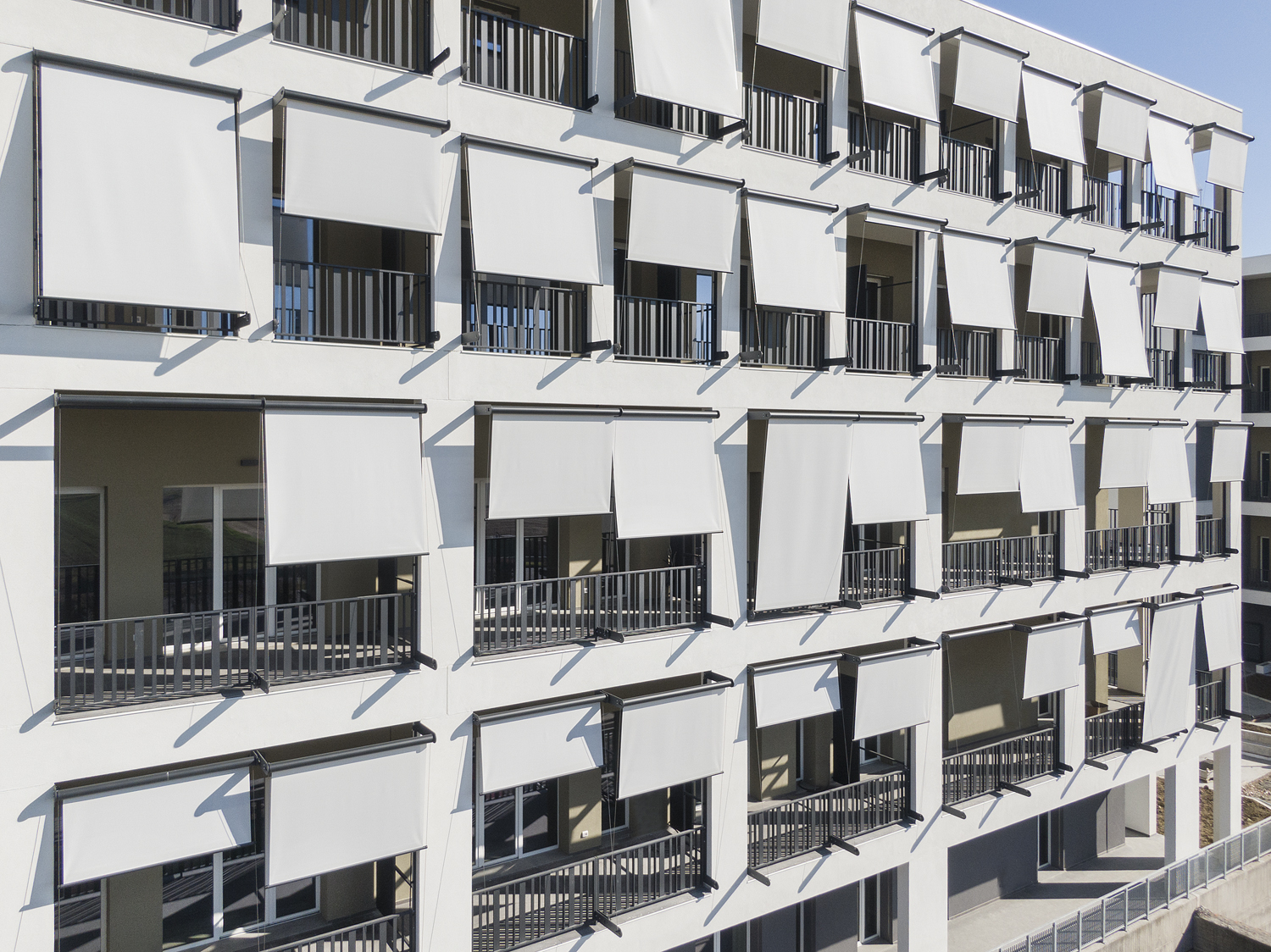 La percezione degli edifici avviene a due velocità: quella più sostenuta che si ha percorrendo in automobile via Ferrari, e quella più lenta del passeggio a piedi all’interno del complesso. E’ in base a ciò che si è lavorato sul linguaggio architettonico e sui volumi: verso l’esterno si è uniformata la linea di gronda per conferire una immagine maggiormente ordinata e omogenea dei differenti blocchi, variandola invece tra gli edifici e all’interno delle corti. All’esterno, una nuova griglia modulare composta da due sistemi viene sovrapposta alla facciata esistente: quello dei parapetti, e quello delle tende a rullo montate contrapposte a formare un sistema “a farfalla” che restituisce, per la porzione di facciata esposta a sud ovest, un effetto articolato vibrato e cangiante a seconda delle ore del giorno e delle stagioni. Ultimo elemento che contraddistingue la proposta architettonica e definisce il carattere degli edifici è rappresentato dal colore: chiaro per la griglia e le tende, e più scuro per il fondo delle logge. Le pareti delle corti interne vengono colorate diversamente rispetto alla diversa luce solare che li colpisce durante la giornata.