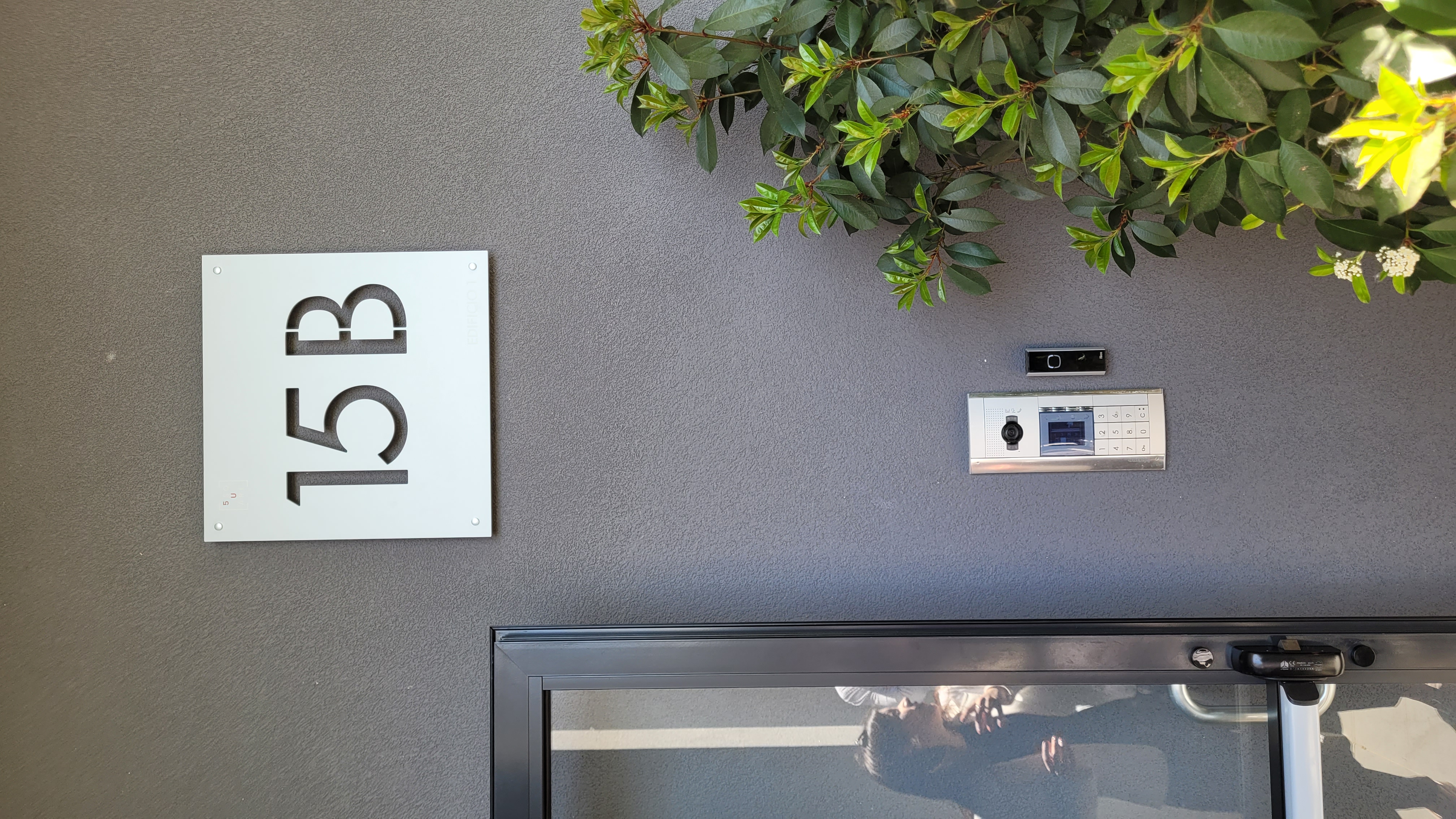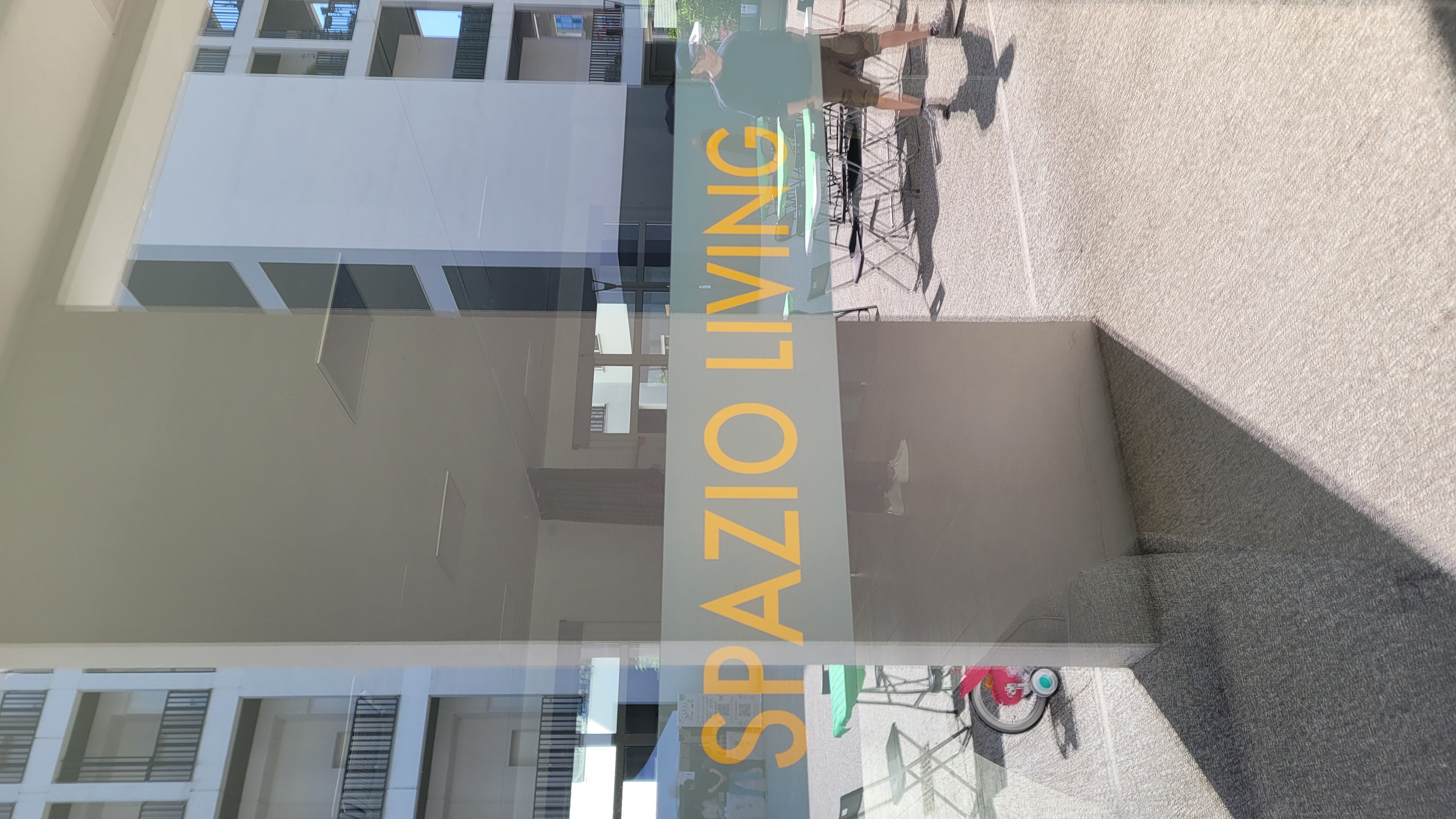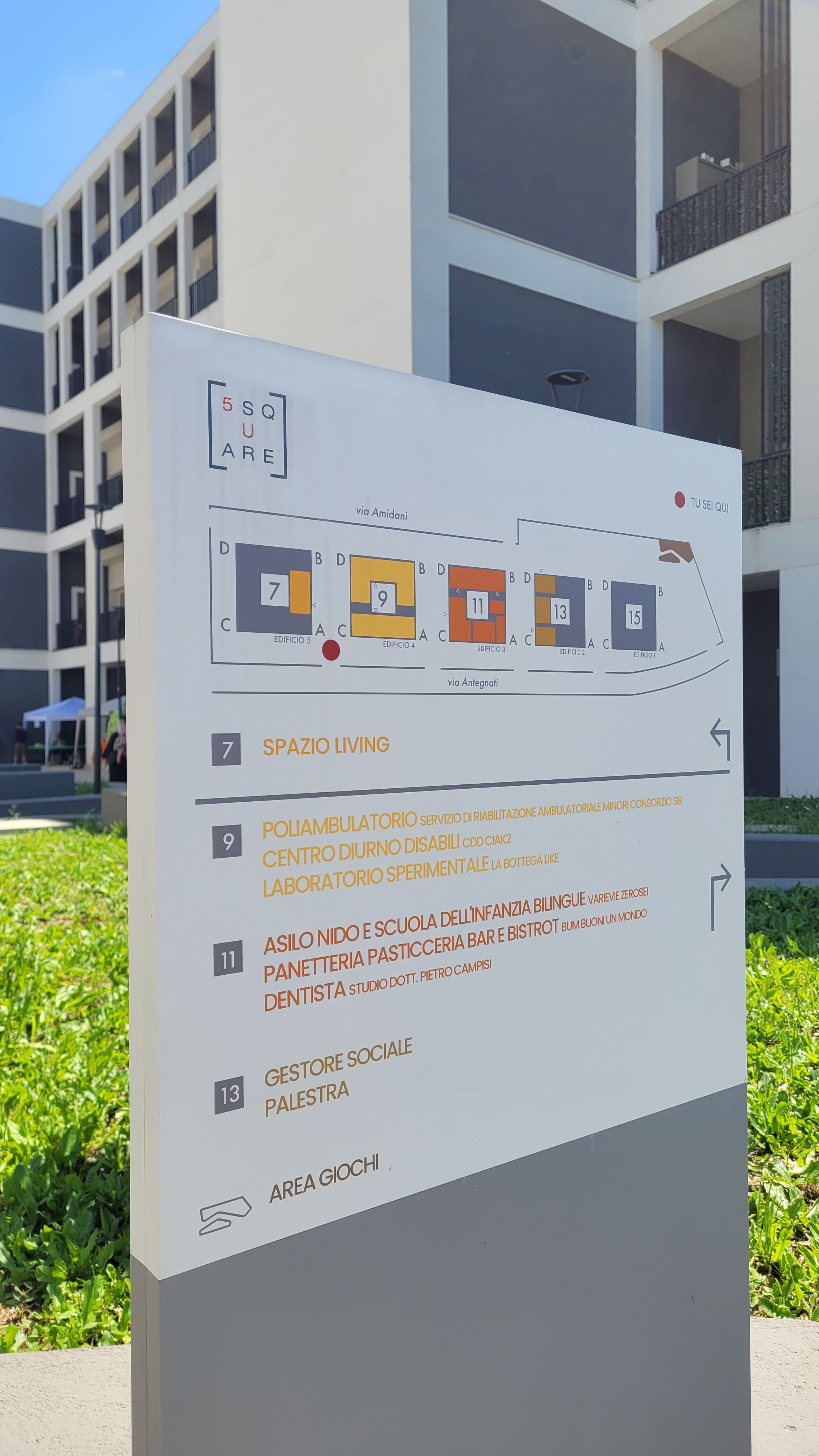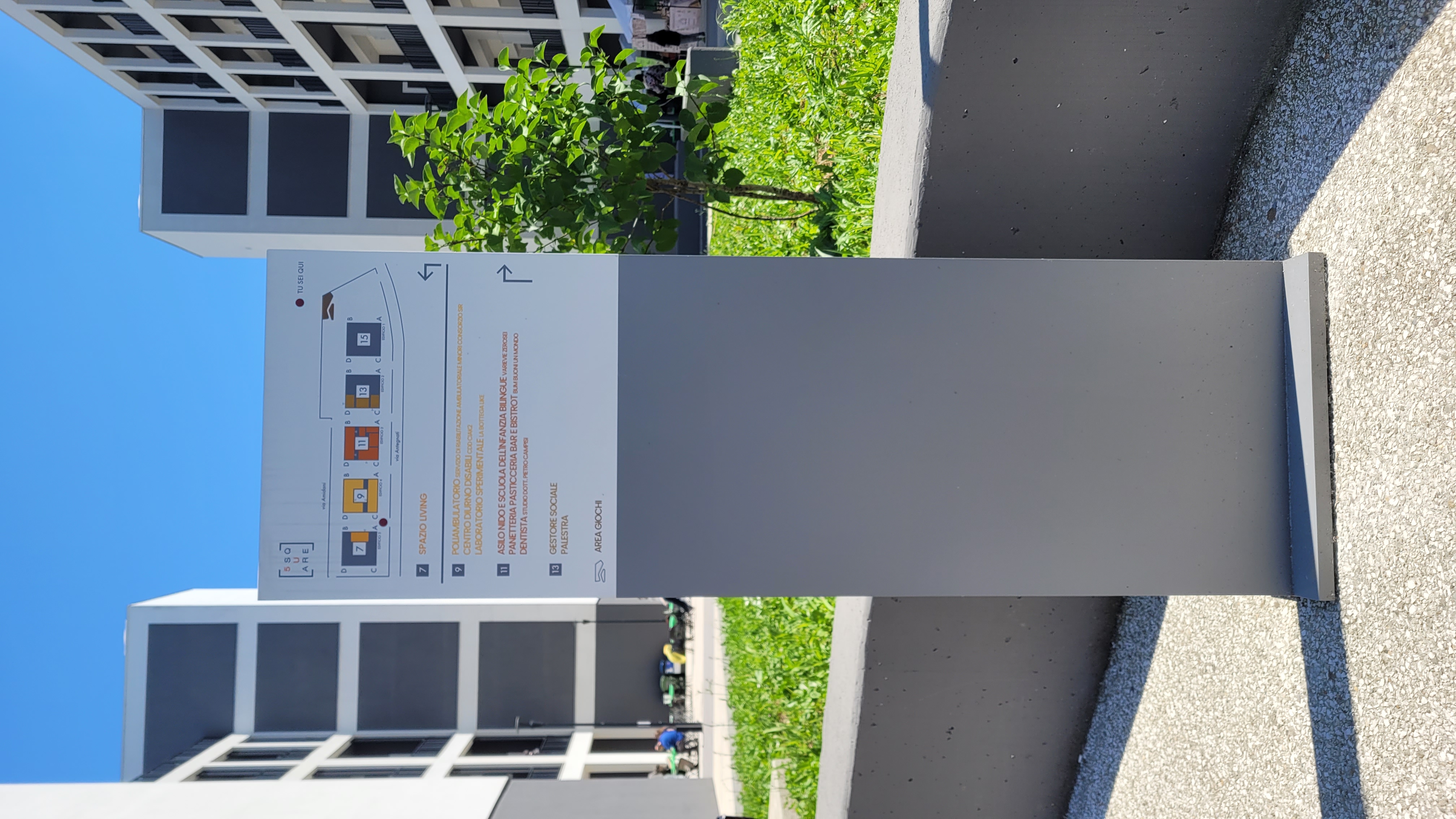 Lo studio si è occupato anche del progetto di signage e orientamento dell’intero complesso, disegnando i totem posti vicino all’ingresso da via Antegnati, la numerazione degli edifici, dei loro ingressi e dei vari piani nelle scale, e delle vetrofanie delle attività al piano terra.