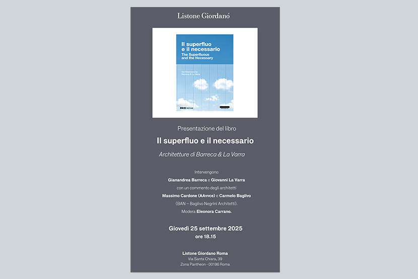 – 25/09/2025, ore 18.15, Listone Giordano Roma – Partecipano gli architetti, l’Arch. Massimo Cardone e l’Arch. Carmelo Baglivo, modera Eleonora Carrano (Via Santa Chiara, 39 Zona Pantheon – 00186 Roma)